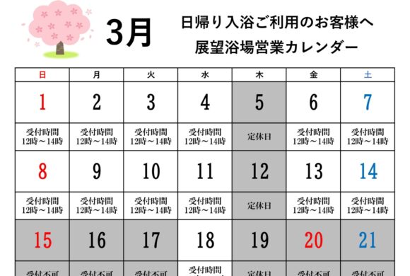 - 3月の日帰り入浴営業カレンダー