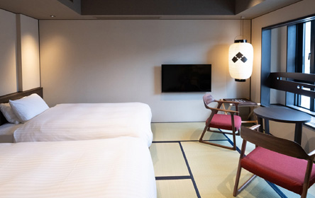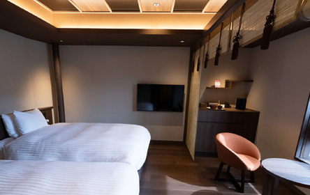 日本間で寛ぎ、お休みは2台のラグジュアリーベッドをご利用ください。畳に布団を敷き、ご家族様一緒やグループでのご利用も多いお部屋です。
