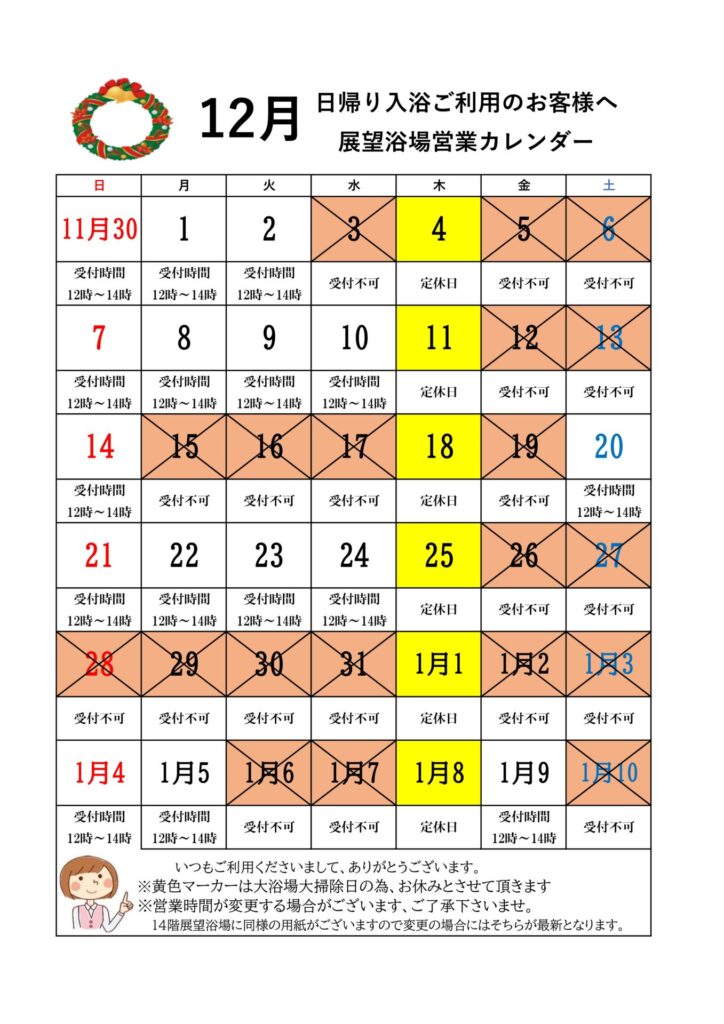 12月の日帰り入浴営業カレンダー