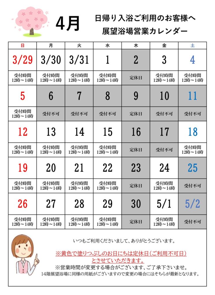 14階 温泉展望浴場「湖空の湯」の日帰り入浴営業日程をご案内いたします。